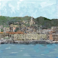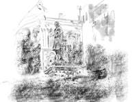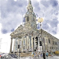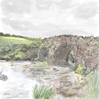 Under a grey sky and across green hills, this bridge stands in clear waters. Cotswolds